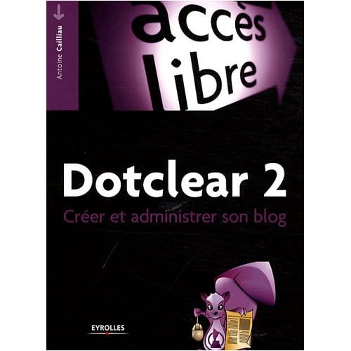 Créez un blog qui vous ressemble en rejoignant la communauté des utilisateur-de Dotclear, le moteur de blog français le plus populaire Installez et configurez Dotclear. Adoptez les bonnes pratiques de rédaction et de périodicité de publication. Interagissez avec vos lecteurs grâce aux commentaires, blogrolls et rétroliens. Organisez vos billets avec les catégories et les tags. Exprimez-vous avec des images, des vidéos et du son. Enrichissez votre blog avec des extensions - Personnalisez votre blog avec des thèmes. Améliorez votre référencement grâce aux sitemaps, plug-ins et sites de partage (RSS). Protéger les commentaires du spam, fléau des blogs. Orientez-vous dans le dédale des licences libres et choisissez la plus adaptée à vos besoinsBroché=241 pages. Editeur =Eyrolles (21 novembre 2008). Collection =Accès libre. Langue =Français. ISBN-10=2212124074. ISBN-13=978-2212124071. Dimensions du produit=20 x 1,5 x 15 cm. Moyenne des commentaires client =4.5 étoiles sur 5 2 commentaires client. Classement des meilleures ventes d'AmazonDéveloppement WebProgrammation et langages=388.342 en Livres (Voir les 100 premiers en Livres) .zg_hrsr { margin: 0; padding: 0; list-style-type: none; } .zg_hrsr_item { margin: 0 0 0 10px; } .zg_hrsr_rank { display: inline-block; width: 80px; text-align: right; } n°491 dans Livres > Informatique et Internet > Internet > n°1150 dans Livres > Informatique et Internet >.Un excellent livre pour bien comprendre dotclear 2. En plus, c'est le seul livre disponible.. tout à fait abordable pour les non-initiés.explicite très bien l'esprit d'un blog, ses points forts et ses points faibles. La partie technique est très claire..